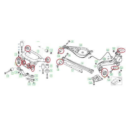 BMW E46 hátsó lengőkar szilent és bölcső szilent szett tartalma: