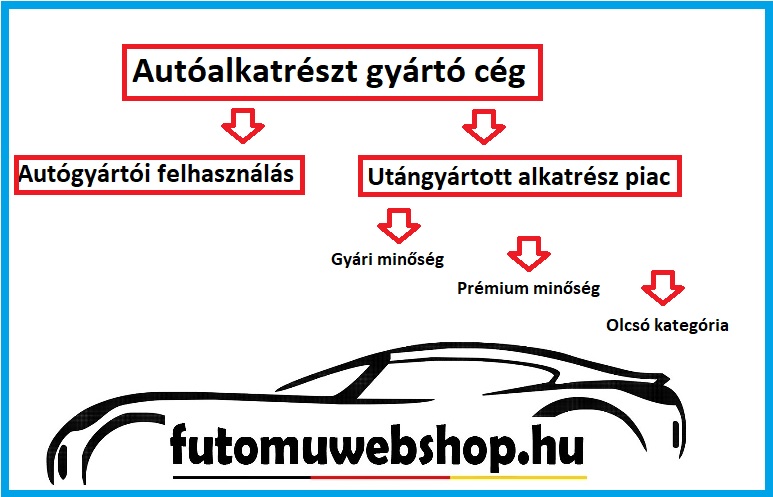 A gyári beszállítók piacán lévő gyártók ugyan úgy megtalálhatók az utángyártott piacon is! Ez már önmagában megéri feltenni magunkban azt a kérdést, hogy akkor rossz az utángyártott alkatrész? A válasz határozottan NEM! Gyári beszállítóknak nevezzük azoknak a gyártóknak a termékeit, akik közvetlenül a gyárba is szállítanak be. Amit biztosan tudni lehet, hogy az autógyártók nem gyártanak lengőkart, kerékcsapágyat vagy éppen lengéscsillapítót. Ezt mind egy gyártótól vásárolják, pl. Sachs, Kayaba TRW, lemförder, ezeket a márkákat és termékeiteket hívhatjuk gyári termékeknek, ők azok, akik jelen vannak az utángyártott alkatrészek piacán is! Továbbá vannak olyan gyártók, akik ugyan nem gyári alkatrész gyártók, de teljes mértékben megfelelnek azok szigorú előírásaiknak és követelményeiknek is. Az ők termékeik a gyári minőségű termékek! Továbbá vannak a mindenki által ismert vagy sokat halott utángyártott alkatrészeket kínáló márkák! Az utángyártott alkatrészeket szintén két nagy csoportra tudjuk osztani! Vannak a teljesen névtelen olcsó termékek és az igazán nagy Brandel rendelkezők! A teljesen noname alkatrészek vásárlásától mindenkit óva intenék, de az ismert Brandekkel rendelkező gyártók teljesítenek minden hazai vagy Európa uniós előírást és minősítést ezért is hívjak őket Prémium minőségű autóalkatrész gyártónak!